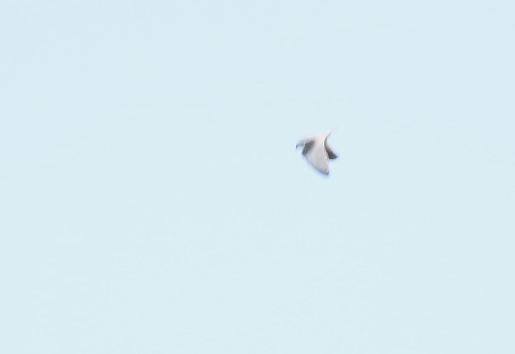 Beskrivelse: Kom indtrækkende fra Klinten nær radaren mod VNV kl.1200 langs bakkekammen nord for hovedstien i "traktorsporet". Sås kun i ca. 10 sek, fra den slap fri bag de høje bøge i øst til den forsvandt bag fyrreskoven i vest. Heldivis nåede jeg lige at tage de 2 vedhæftede, temmelig rystede fotos, før det var for sent. Der gik endda et par sek, før jeg i håndkikkerten så det sorte felt på overarmens dækfjer, og så fik jeg meget travlt med fotogrejet, som heldigvis hang lige parat på skulderen......