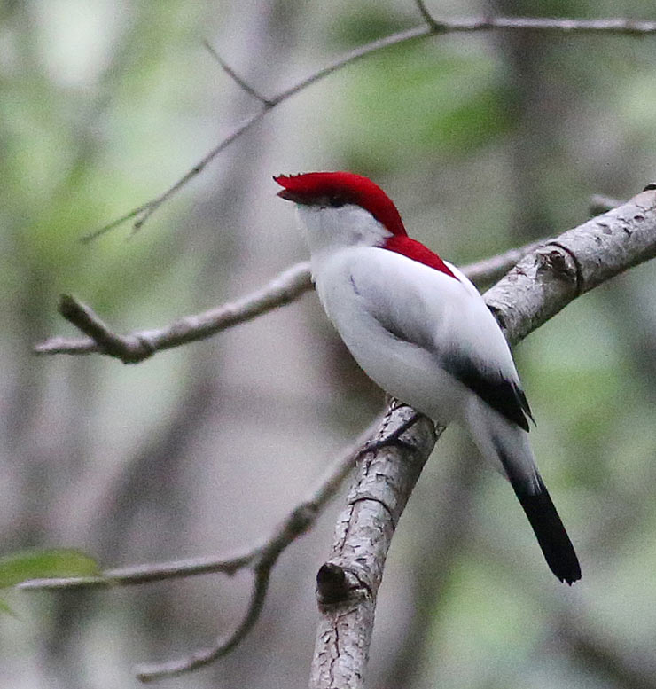 Beskrivelse: Superendemernes superendem! Denne særegne art, der ikke ligner noget andet, blev først fundet i 1996, og har en nuværende verdensbestand på 20 par. Den findes langs en 60 km. langs bjergkæde, hvor den holder tid ved klæfter med vandløb. Da arten blev opdaget antog man at der var tale om en albino-populaion af Helmeted Manakin, men hurtigt blev det klart, at her var tale om noget helt nyt. Og at se en karakteristisk art har kunnet gå uopdaget hen siger ret meget om den ringe ornitologiske aktivitet i de øde og vidstrakte områder i nordøstlige Brasilien. Ønsker man at se fuglen er det til gengæld forbilledligt nemt. Den ovenfor nævnte Araraja Park, der ligger ca. 20 km. udenfor byen Crato, er en art vandland i skoven med restaurationsbygning og flere svømmeanlæg. Kommer man hertil går man ad en sti langs vandløbet lidt væk fra "vand-aktiviterne". Stien overskuer en lavning med løvtræer og vandløb, og på en 3-400 meter lang strækning sås 3 hanner og to hunner. Det var - i al sin surrealisme - lidt som at finde Lundsanger bag Geocenter Møn i juni.