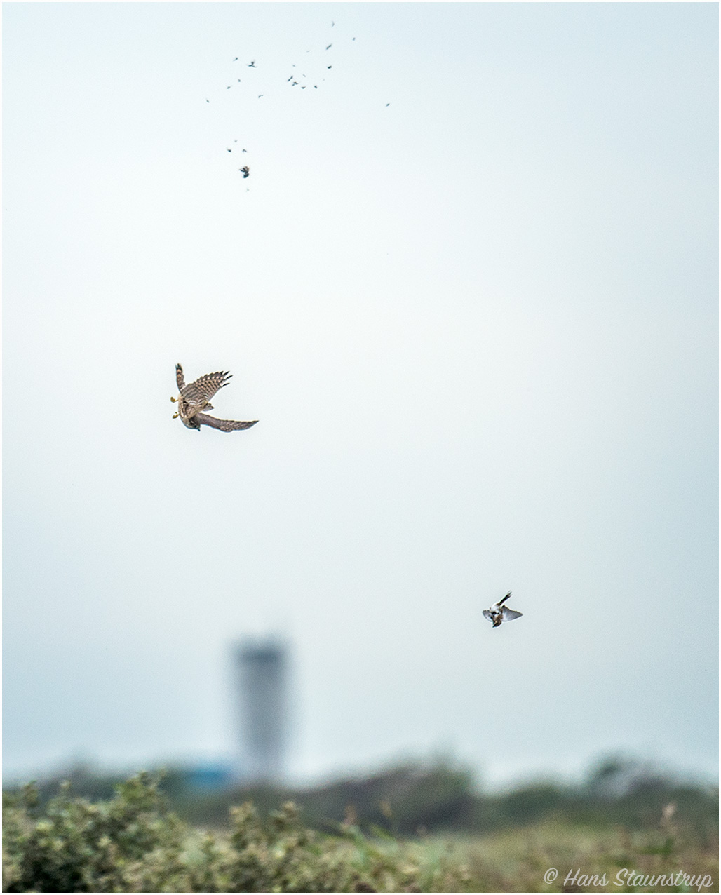 Beskrivelse: Et brus af hundredvis af fugle, der letter, fik mig til at kigge til venstre . Der lavt over marken kom den lille Dværgfalk med hurtige vingeslag. Kameraet blev snurret rundt, og først da falken kom over horisonten, fik jeg den i søgeren. Pufff en lille fjersky indikerede, at en småfugl blev ramt. Fuglen faldt mod jorden, stærk forfulgt af Dværgfalken. Da den nåede sivene, fangede den fuglen i klørerne. Falken forsvandt ud over engen. Bagefter kom den lille bundt fjer, som svævede sagte afsted i vinden.