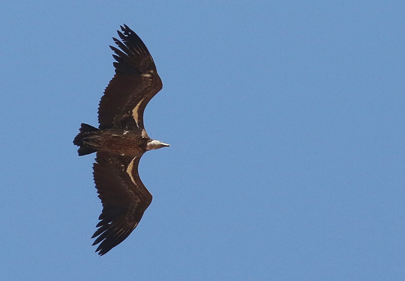 Beskrivelse: Yngre Rüppells Grib er meget mørke med afstikkende lyst "gribbebånd" over armen. De lyse partier er gråtonede og koldt farvede i modsætning til Gåsegribbens varmere gul- eller rødbrune, og man ser lysskællet undergump (meget tydeligere hos ældre fugle), hvor Gåsegribben er ensartet. En heldig observation, da denne fugl var den eneste grib, der var på fotohold på lokaliteten.