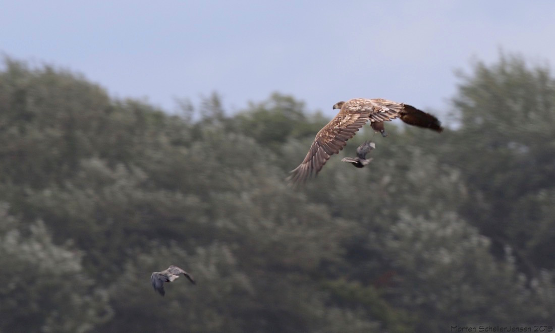 Beskrivelse: Denne unge Havørn har specialiseret sig på Ringduer der går på nyhøstede kornmarker. 3 gange så jeg den komme med stor fart hen over markerne for at overraske Ringduerne. Her er det lykkes men mobbes af Krager