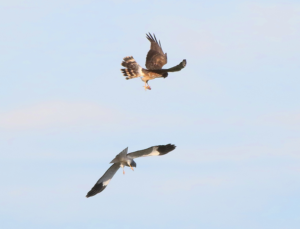 Beskrivelse: Blå kærhøg par danser længe omkring hinanden i luften. Roterer så bugen vender op. Male kaster musen op i luften. Female griber. Han flyver videre, og efter et stykke tid dukker en juvenil op. Adult female og juvenil danser et stykke tid, juvenil kærhøg sætter sig på marken og mor smider musen. Herlig oplevelse, som viser stærke bånd og fin yngelpleje. På andre af mine fotos ses tydelig forskel på adult female bug, lys med striber, og juvenil bug, mere bruntonet med striber.