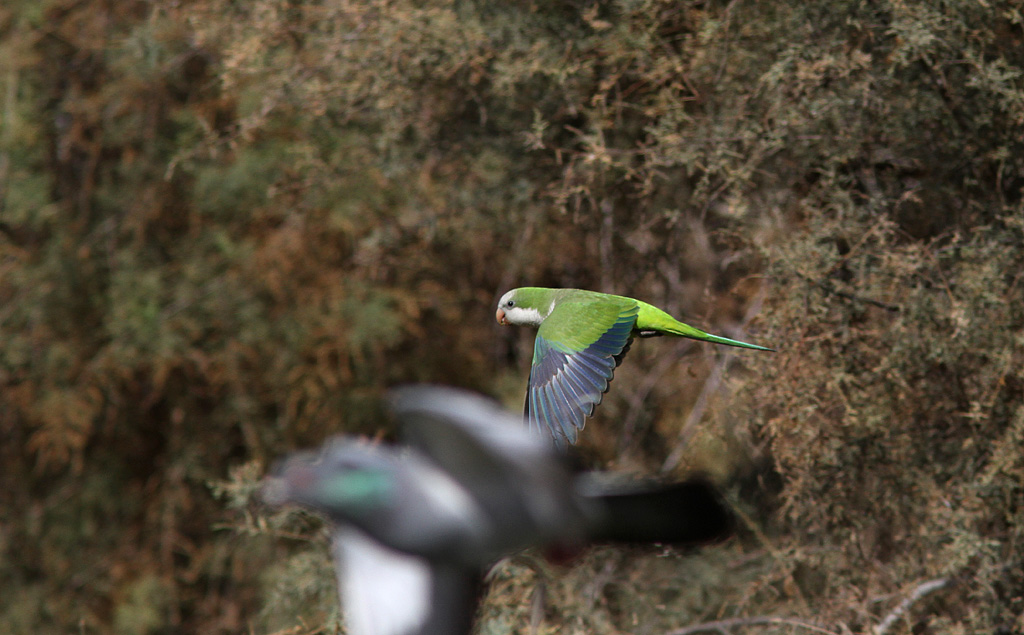 Beskrivelse: Lige ved og næsten. Endeligt en Munkeparakit inden for fotoafstand, og så flyver der en skide tamdue op og dækker lidt af vingen på Munken.