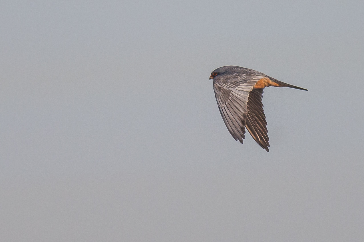 Beskrivelse: Fuglen rastede på stranden inden den og 5 andre Aftenfalke trak lavt ud ved den yderste klitrække på Grenen, denne uforglemmelige dag med svag sydøstenvind.