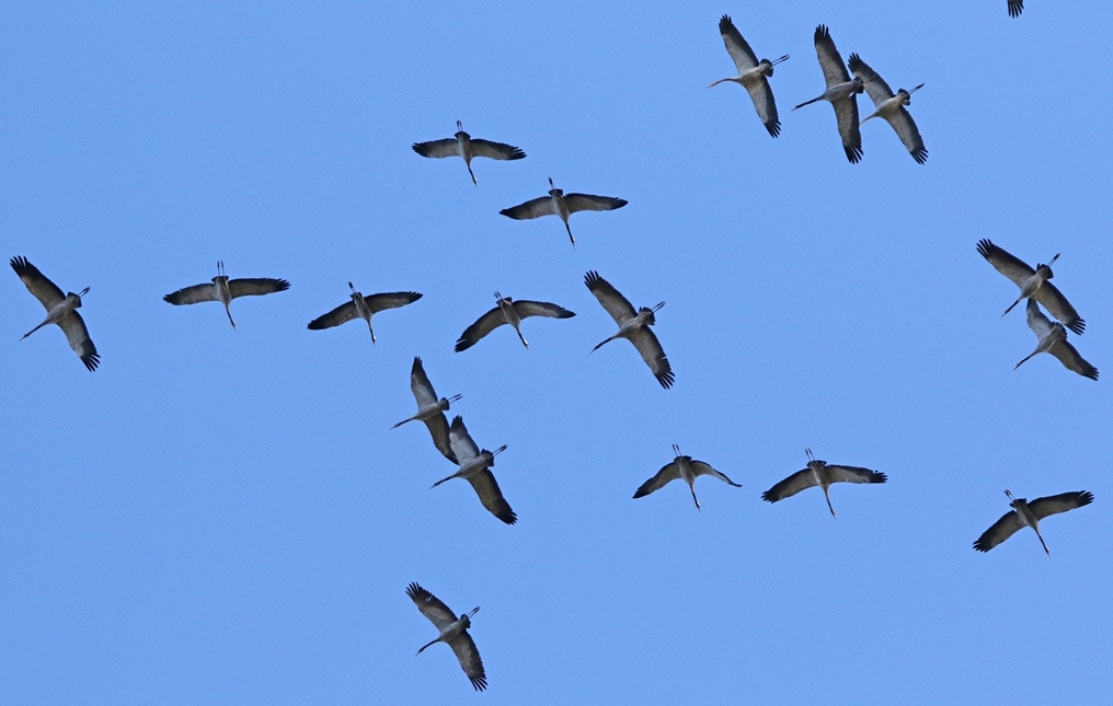 Beskrivelse: Tranerne skruer sig op i flere niveauer, før de fortsætter trækket mod syd.