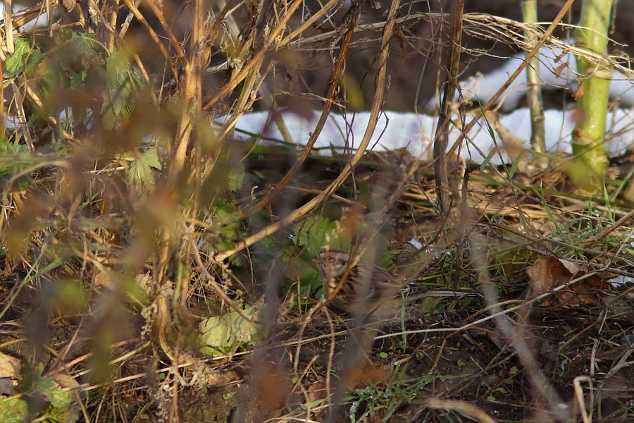 Beskrivelse: Selv om fuglen undertiden sad mere åbent, var den meget af tiden aktiv på jorden i halvtæt urtebevoksning. Ikke et kønt billede, men karakteristisk!