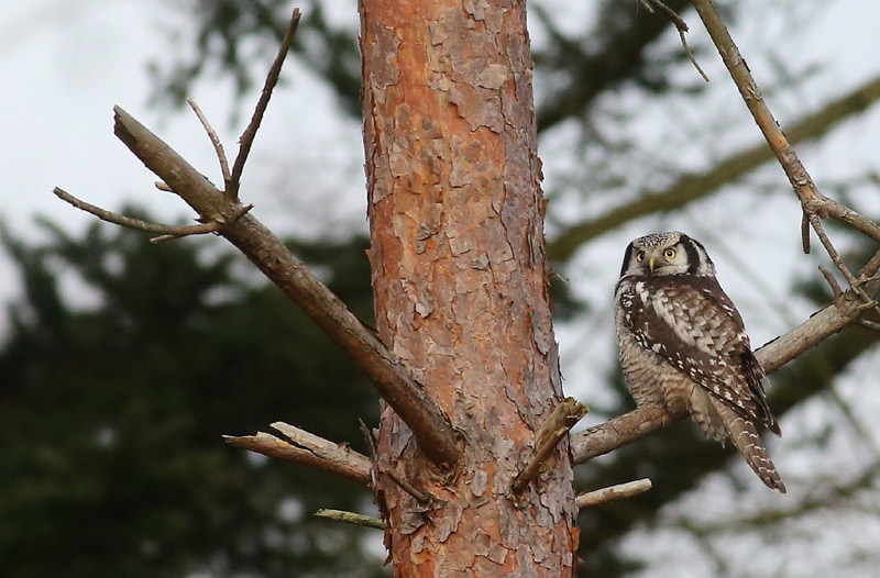 Beskrivelse: 1K Høgeugle ligner adult, men kan kendes på gråbrune tertiærer med svage, ikke gennemgående lyse bånd; adult har sortere tertiærer med gennemgående hvide bånd og af farve som svingfjerene. Halefjerene er tilspidsede og brunlige med smalle hvidgrå tvårbånd. Adulte har afrundede og sortere halefjer med tydeligere hvide tværbånd. Disse alderskarakterer vises godt på denne fugl, hvor man også bemærker de brunlige rygfjer, der også er en ungfuglekarakter.