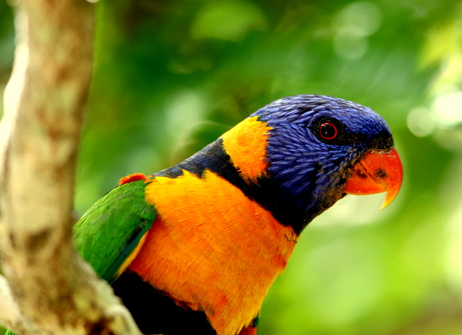 Beskrivelse: Close-up, common, noicy, fast and visible like is southern and eastern relative Rainbow Lorikeet. Note the orange/yellow pollen from the flowers.