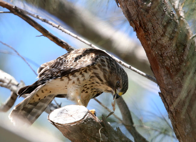 The adult birds were observed to catch and eat medium sized Iguanas - but the young one was only given small prey. In the garden also breeding Eastern Screech-Owl