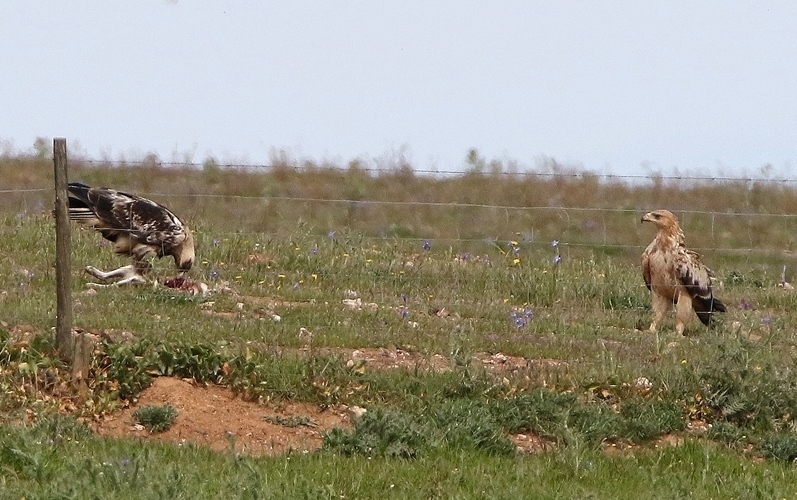 Beskrivelse: To immature ørne havde fået fat i en hare. Sortkrager og ravne moppede dem, og pludselig kom en adult kejserørn og huggede haren. De unge ørne måtte bare se til.