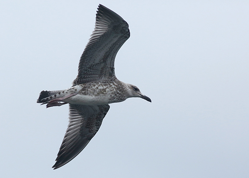 Beskrivelse: Kaspisk Måge af den mørkeste type - havde jeg ikke haft adgang til serier af nyligt udfløjne juvenile fugle fra Azerbaijan, havde jeg betragtet en fugl med så mørktegnet undervinge og så udbredt mrkt på hoved og bryst som en mulig hybrid, men sådan ser de mørkeste Kaspisk Måge altså ud. Fuegens jizz var "urtypisk".