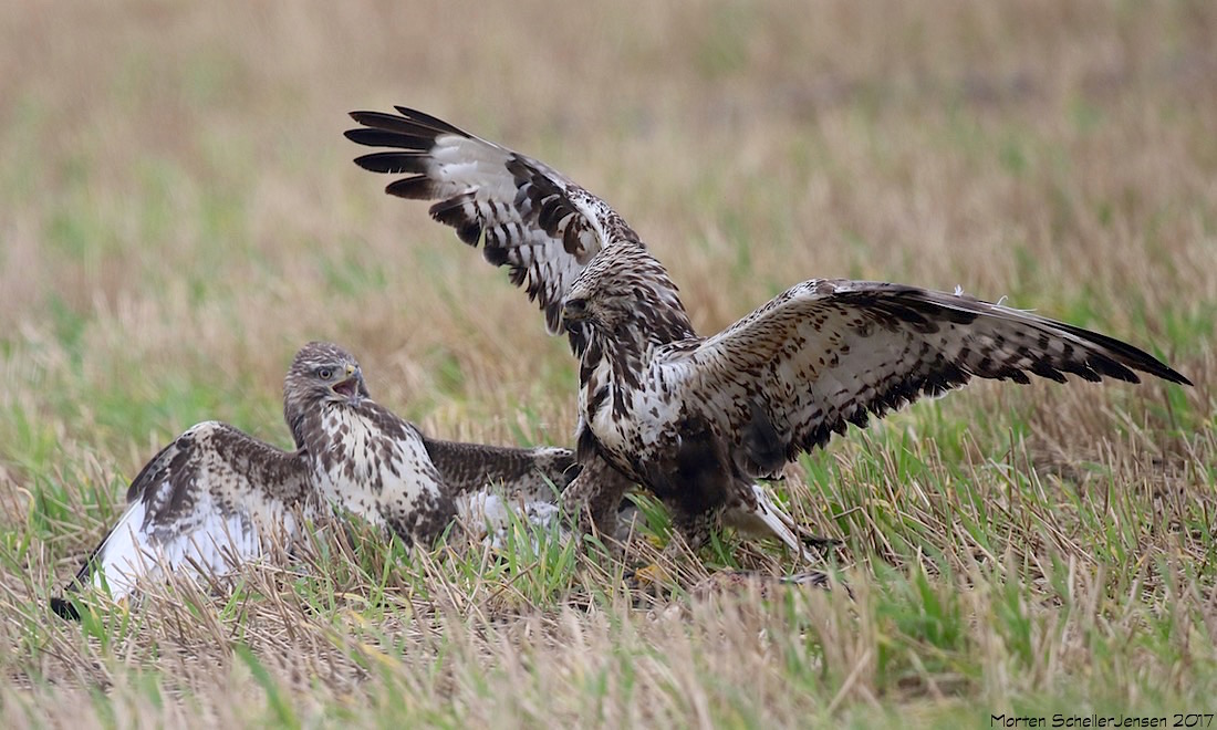 Beskrivelse: Musvågen havde slået en Tårnfalk da en Fjeldvåge pludselig slår ned og stjæler byttet