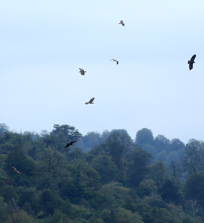 Beskrivelse: Blandede ørneflokke er reglen på gode trækdage ved Batumi ved overgangen mellem september og oktober. Her ses oversider af Lille Skrigeørne og Dværgørne, mens de Store Skrigeørne ses i silhuet.