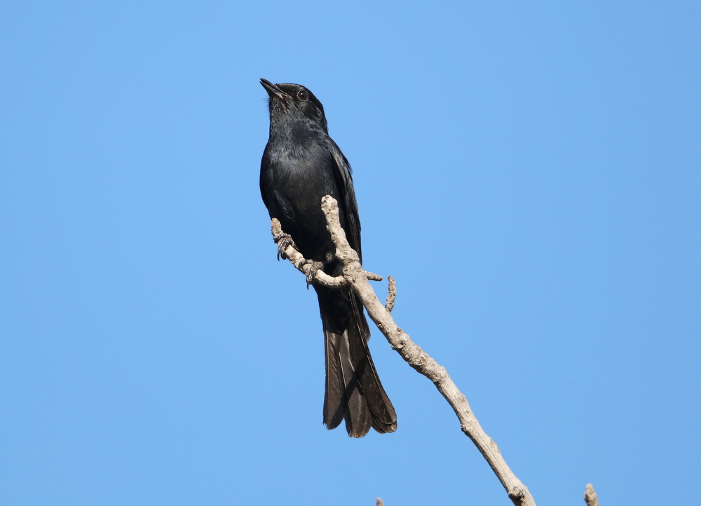 Beskrivelse: A bit like Fork-tailed Drongo (also present in the area), - but no forked tail and black eye (not red).