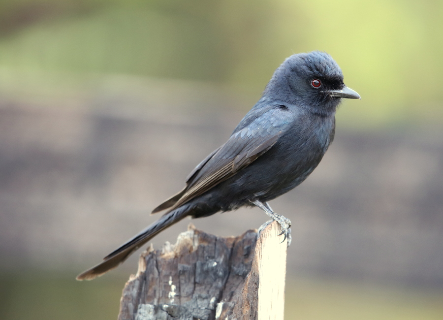 Beskrivelse: A bit like Southern Black Flycatcher (also present in the area), - but here a forked tail and red eye (not dark)