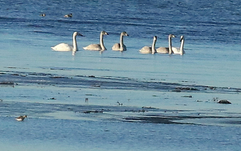 Beskrivelse: Det er på denne afstand, Sveriges Stor Gulben ses på efter nytår, hvor den har slået sig ned i et fortsat lavvandet område (fortsat p.g.a. formodet tilfrysning), hvor den løst flger en flok storspover. Den fouragerede en del, men var ved passage af såvel Vandrefalk som Havørn den eneste fugl i området, der ikke lettede, hvilket kunne vække bekymring. Fuglen ligner på afstand en typisk større klire - ikke så hvidklireagtig som jeg mindes fra Amerika. Den virker større end Rødben, mere kompakt med mørktegnet hoved, bryst og overside imod hvid bug.Hovedet virker relativt lille, skønnet mindre end Hvidklirens og næbbet lidt kortere og mere lige. De gule ben ses ikke her, men afslører effektivt fuglen - og den kan jo teoretisk fortsætte sydpå til Danmark.