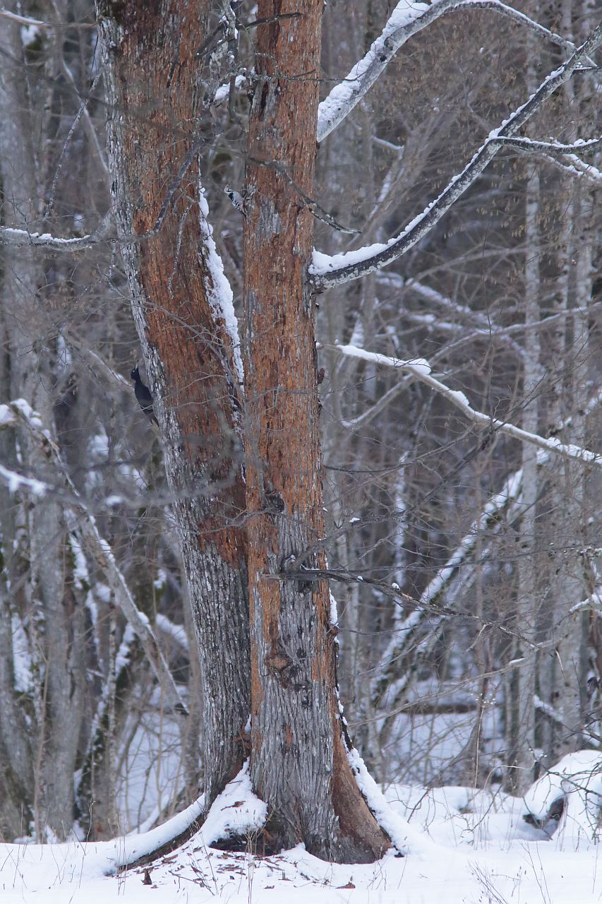 Beskrivelse: En Hvidrygget flagspætte har kunnet ses i Garphyttan siden september 2017. Den fouragerer dagligt på insekter i løvtræerne på Lövängen. Her sammen med en Sortspætte.