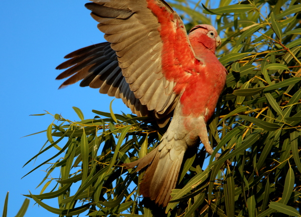 Beskrivelse: Under-wing showed nicely when trying to hold on to the eucalyptus (feeding)in the strong evening wind from the sea.