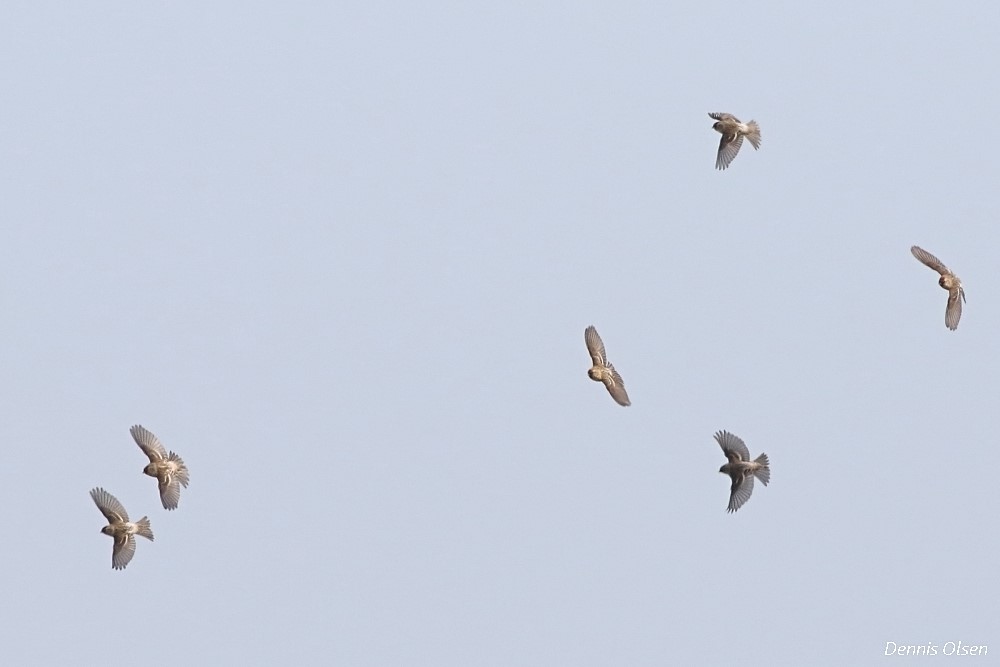 Beskrivelse: Enkelte Hvidsisken med i Gråsiskenflok på ca. 30 fugle.