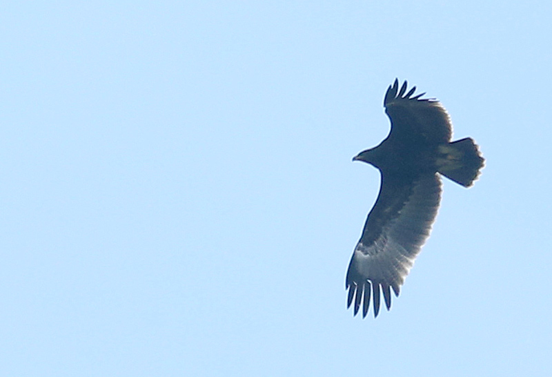 Beskrivelse: Stor Skrigeørn juvenil (alle svingfjer er af samme generation, og med hvid bagkant på armen). Sortbrun med lysere svingfjer. De 7 fingre ses tydeligt, da den syvende er mørk og står ud imod lysere yderdel på de inderste håndsvingfjer, der har smalle bånd, som ikke når fjerens spids. Lyse klamme om knoen ses, men også lyse baser af håndens dækfjer, der her giver effekt af lys dobbeltplet (la Lille Skrigeørn)