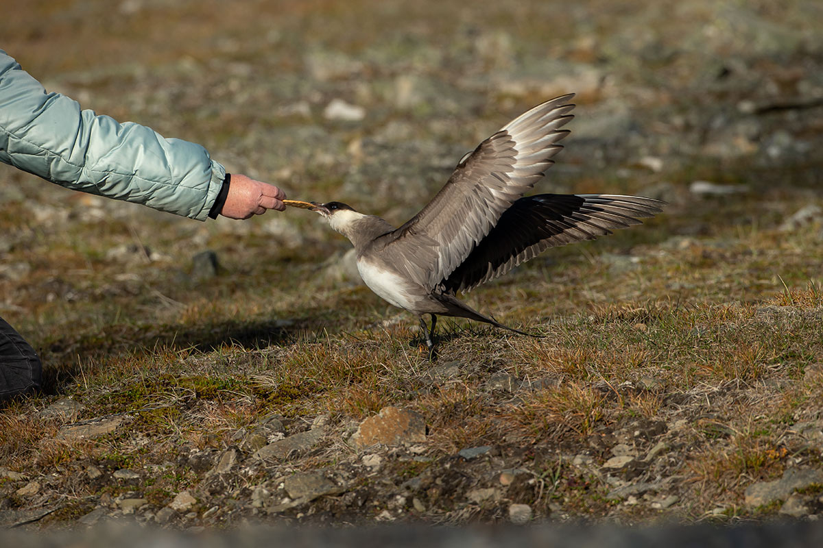 Beskrivelse: Kjove-hviskeren.... Den kom flere gange og hentede kiks på denne måde. Vi så ikke den spiste kiksene, men de blev lagt under nogle sten, til senere fordøjelse.