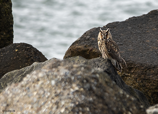 Beskrivelse: Aller yderst på den store mole på havsiden af Agger Tange, sad der pludselig en Skovhornugle.