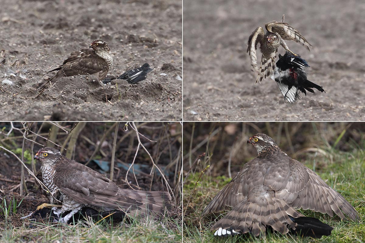 Beskrivelse: 2k Spurvehøg hun, som netop har slået en Husskade. Det tog noget tid, inden den fik klemt livet ud af skaden, og da den forsøgte at flyve væk med byttet, var det tydeligt, at det var på grænsen af dens bæreevne. 20 m blev det til, inden den landede i vejkanten, hvor bilerne drønede forbi. Heldigvis gik det godt (for Spurvehøgen).