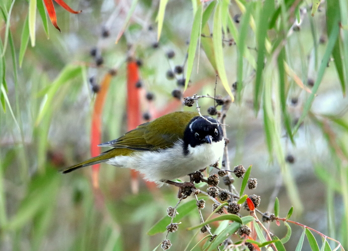 Beskrivelse: Avibase and The Australian Bird Guide (2017) advocates a split from White-naped Honeyeater to a new full species: Gilbert's Honeyeater (M. chloropsis) .. also in English named by it's geographical center in SW WA as 'Swan River Honeyeater'. So I moved my up-load due to that. H'eaters are already a very lage bird-group in Australia; +78 species. Apart from the genetics an obvious difference is the whitish bare skin above the eye - this is red in the nominate form present in east Australia.