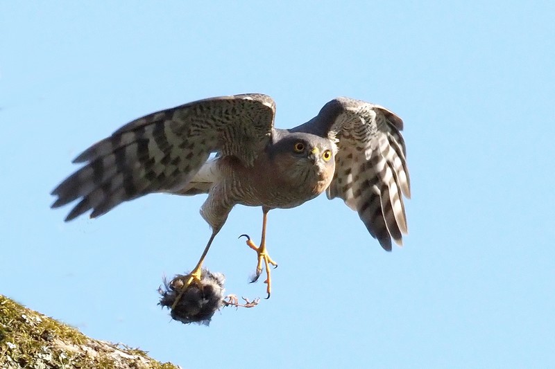 Efter at have kaldt forgæves i nogle minutter, flyver hannen her op i en gran, hvor han omhyggeligt anbringer byttet på en gren og flyver tomhændet bort. Så kan hunnen selv hente det, når hun bliver sulten.