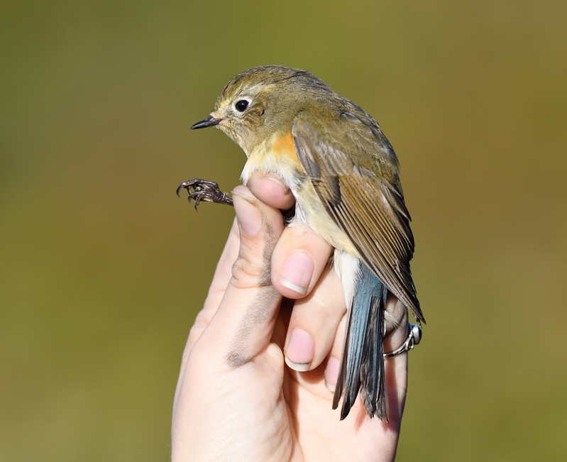 Beskrivelse: En yderst travl morgen med mange fugle i nettene belønnedes ringmærkerne med denne Blåstjert oppe i Fyrhaven.