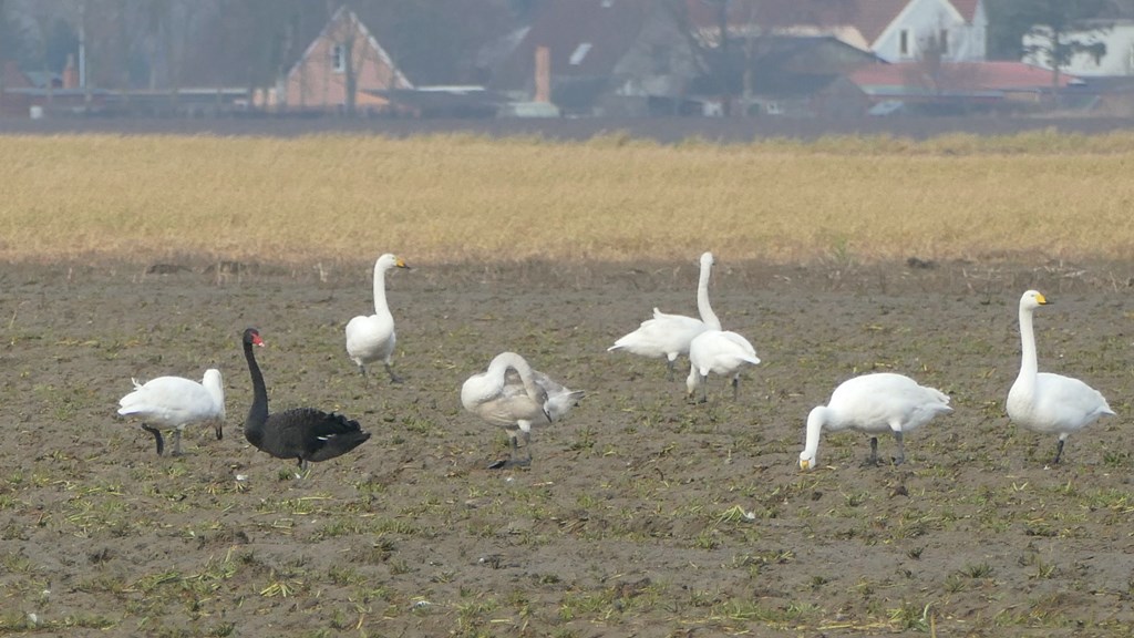 Beskrivelse: Fouragerende i flok med 130 Sangsvaner.