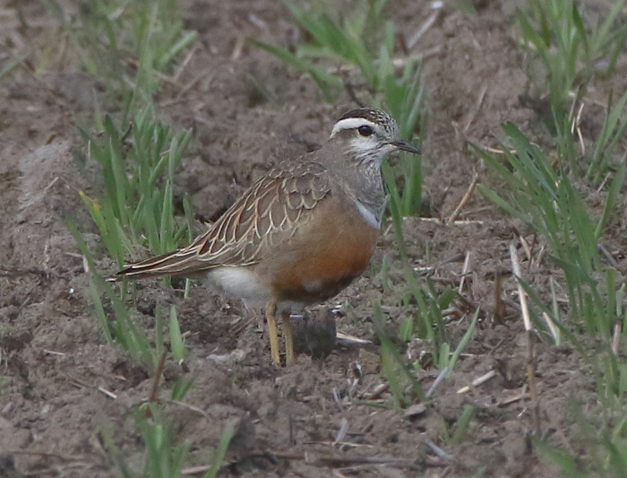 Beskrivelse: Ikke så renfarvet som hunnen på forsiden. Mindre mørk bugplet end female, urent/vaflet ræverødt bryst, grumset grå hals til hvid bryststribe.
