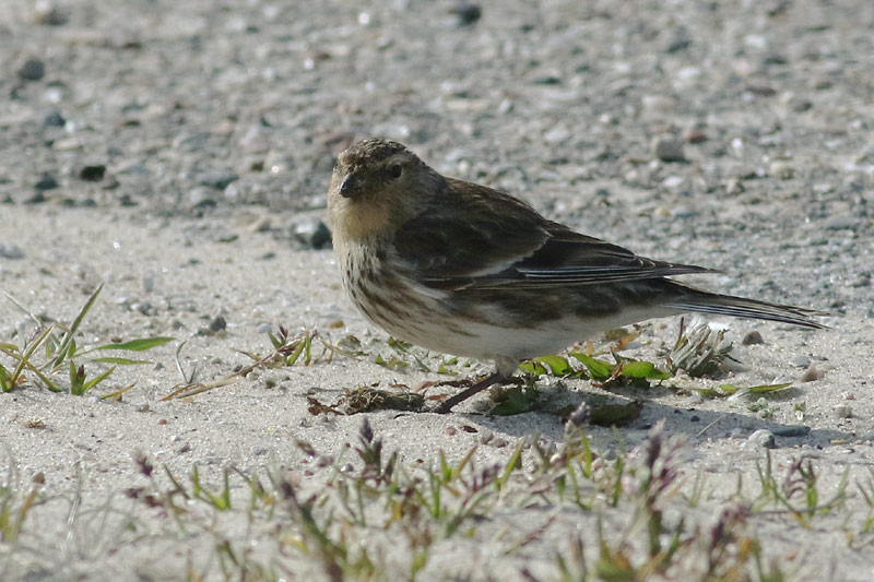 Beskrivelse: Det er ikke så tit, man ser Bjergiriskens sommerdragt herhjemme. Denne forsinkede fugl fra Skagen har denne dragts sorte næb og køligere brune udseende end vinterdragten, hvor gulbrunt dominerer fortil og næbbet er gult.
