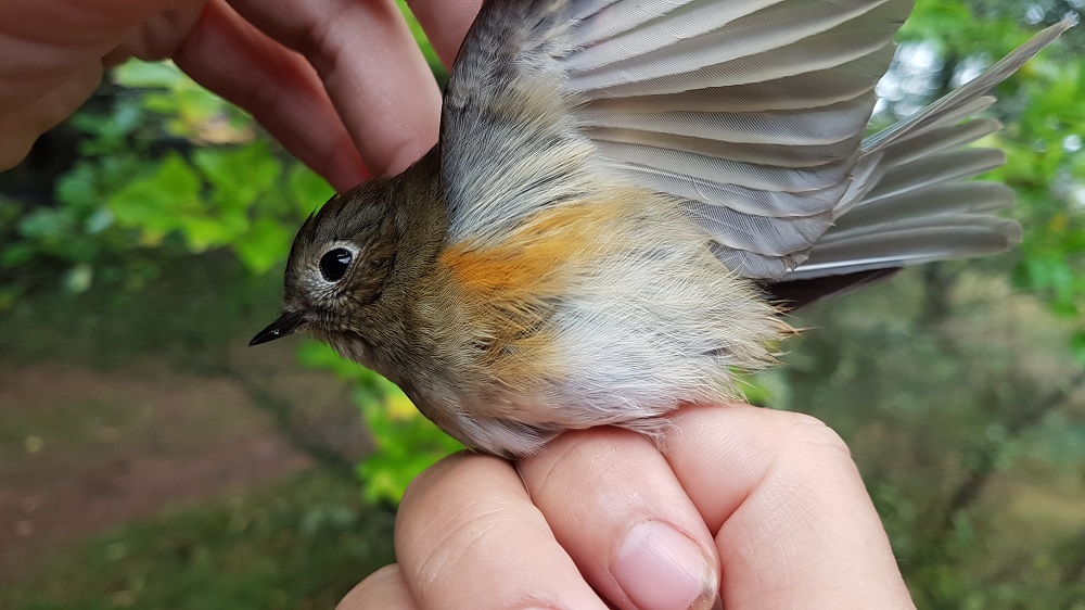Beskrivelse: Ved lukning af net pga. regn fandt Daniel Bloche og Luke Nelson denne blåstjert i et net i stationshaven. Fuglen blev vist op til glade birdere under en Paraply.