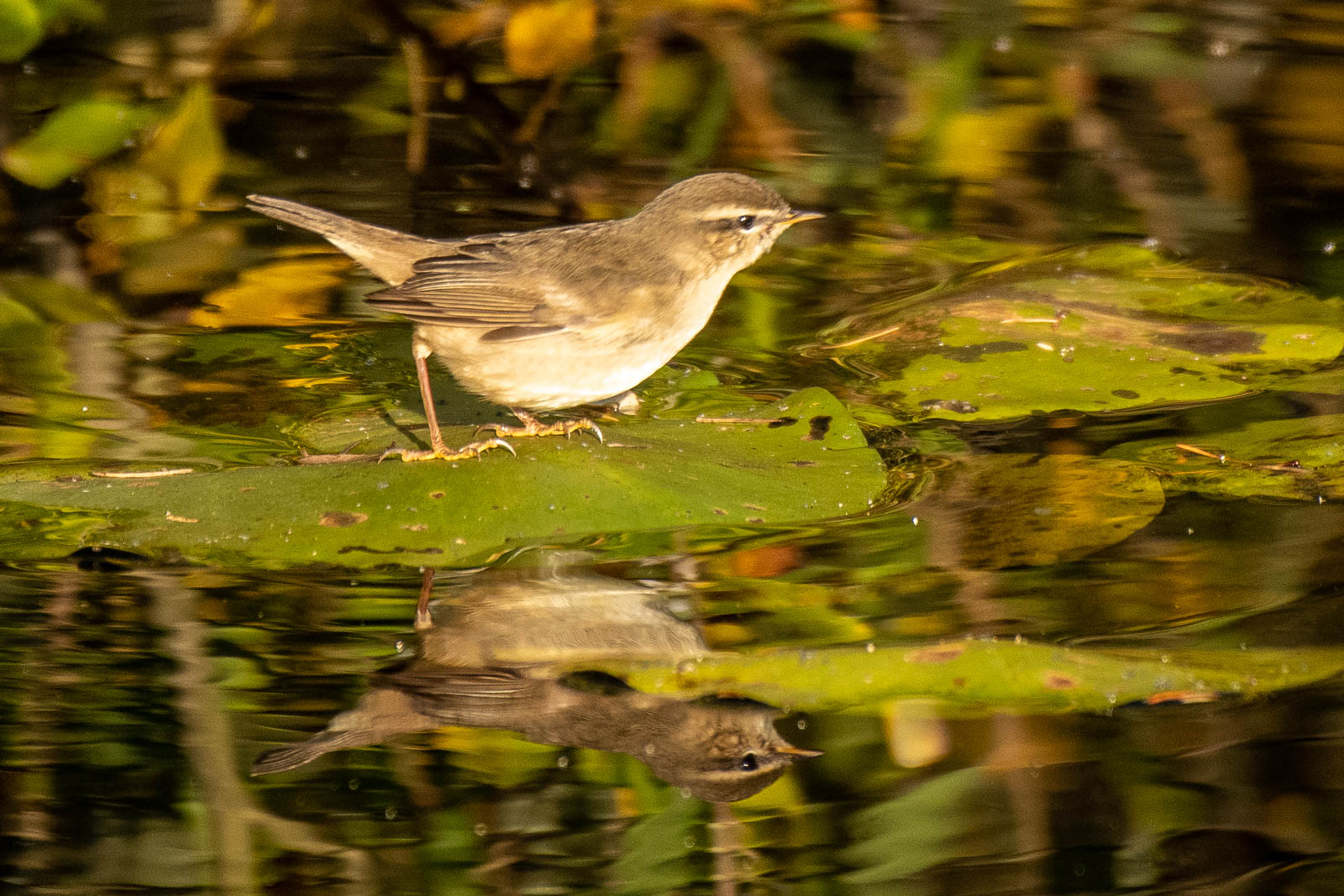 Beskrivelse: Brun Løvsanger fouragerer ved branddammen ved Blåvand Radiomast.