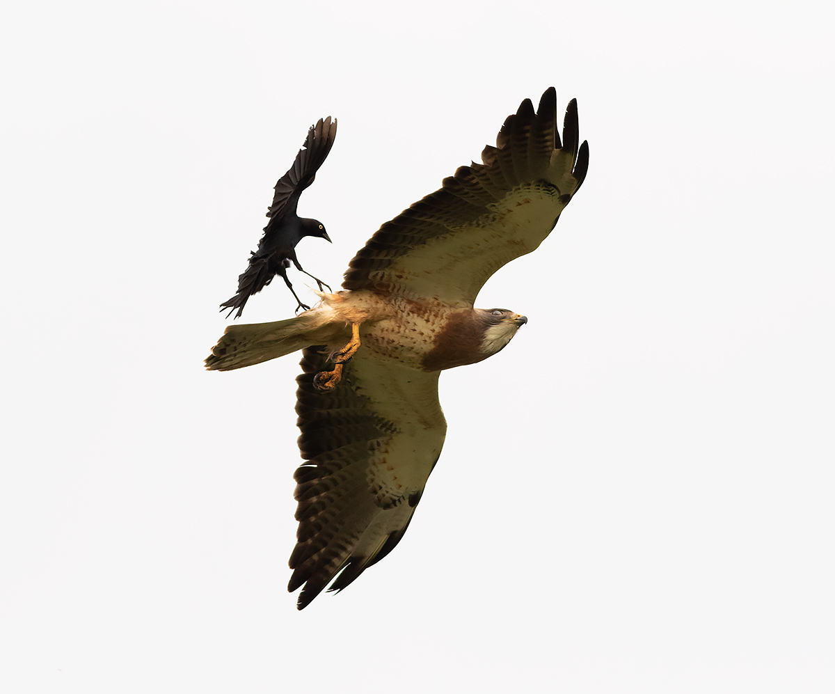 Titel: Brewer's Blackbird attacks Swainson's Hawk