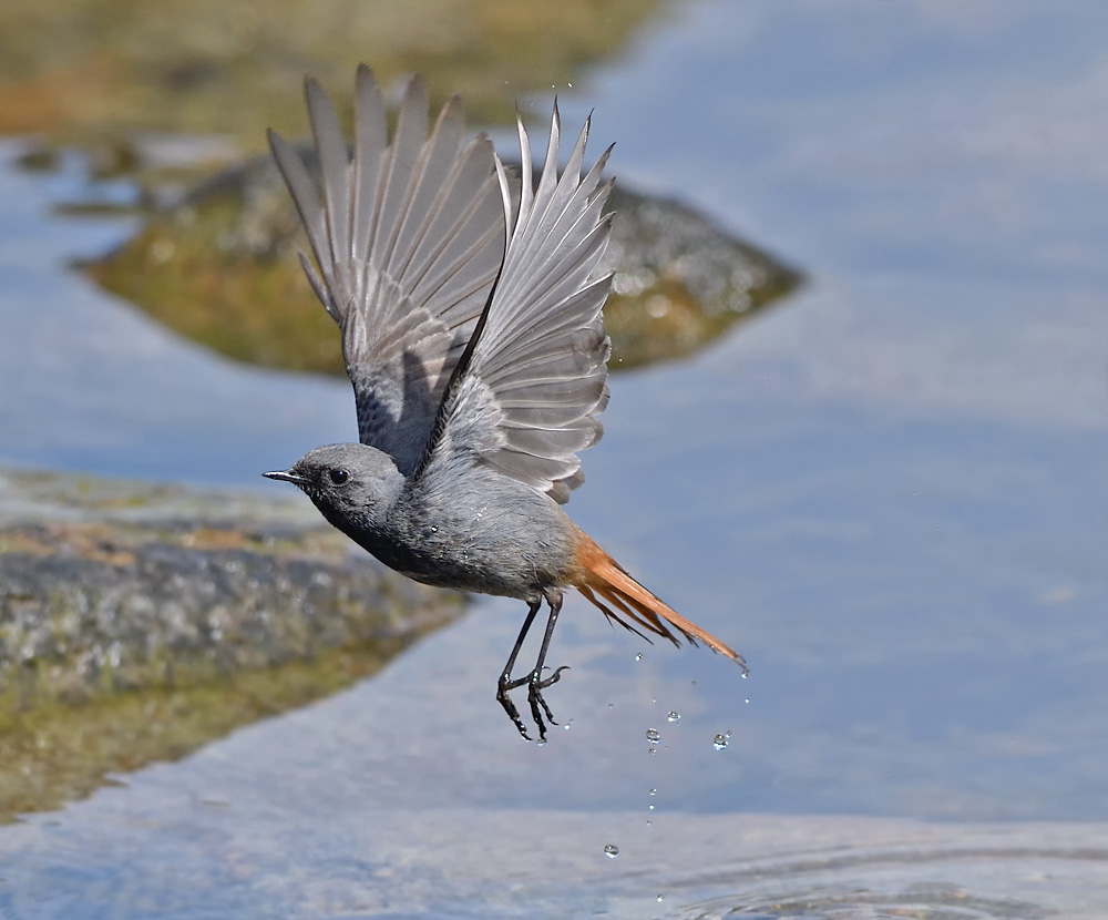 Her en Husrødstjert, som behændigt uden at blive våd netop har forsøgt at snappe et fødeemne fra vandoverfladen.