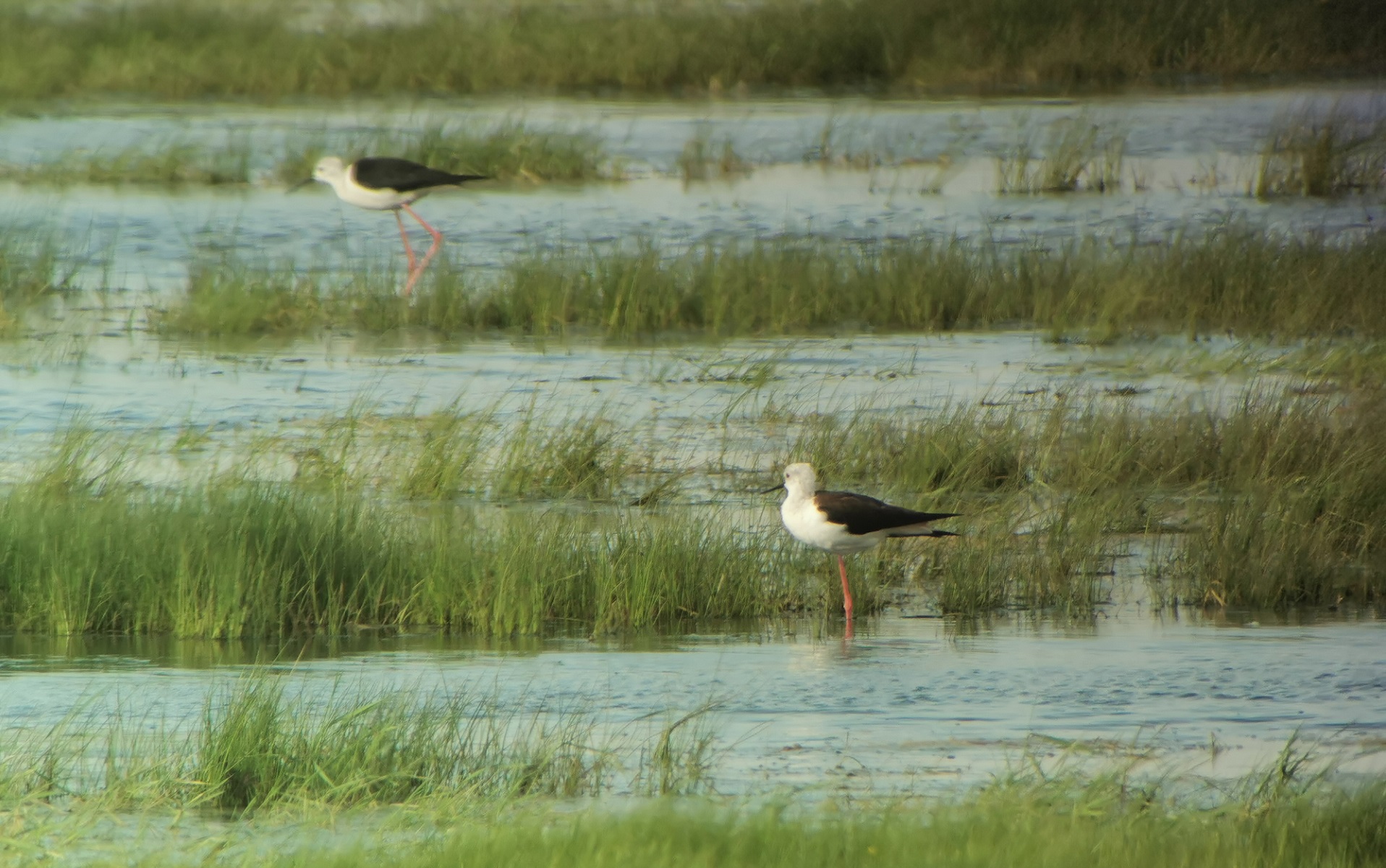 Beskrivelse: To af de i hvert fald op til fire stylteløbere, der i en længere periode blev set i Margrethe Kog og tyske Rickelsbüll Koog. Fuglene var i området i perioden 13.05-10.06. Udover de to afbillede fugle var der en hun og en sortnakket han i området. Foto taget med mobil gennem teleskop.