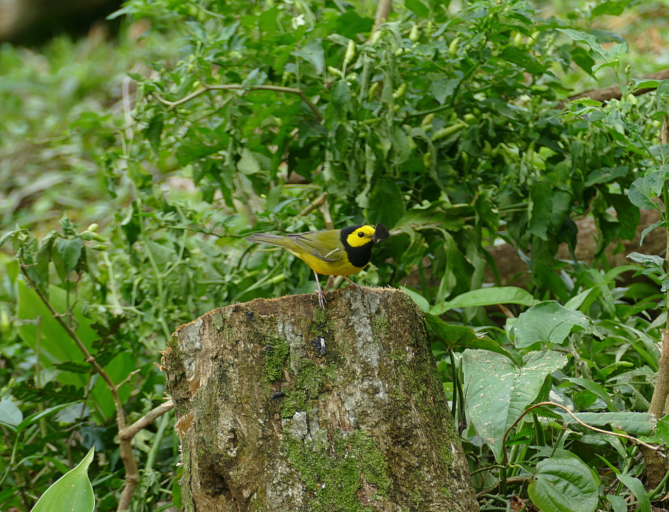 Titel: Male Hooded Warbler with moth.