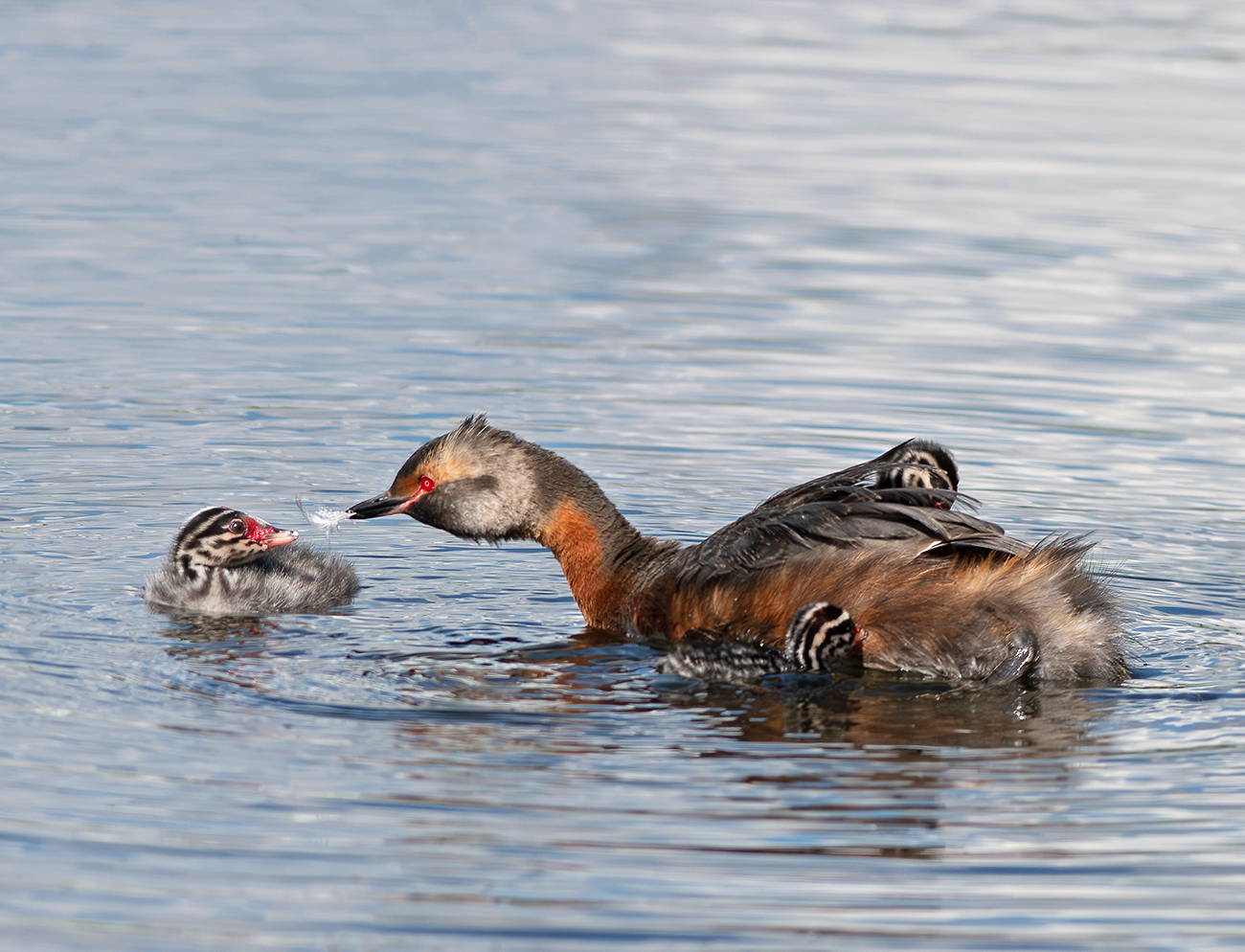 Enkelte gange tilbød den voksne ungen en lille hvid fjer, hvad den først ikke forstod.
