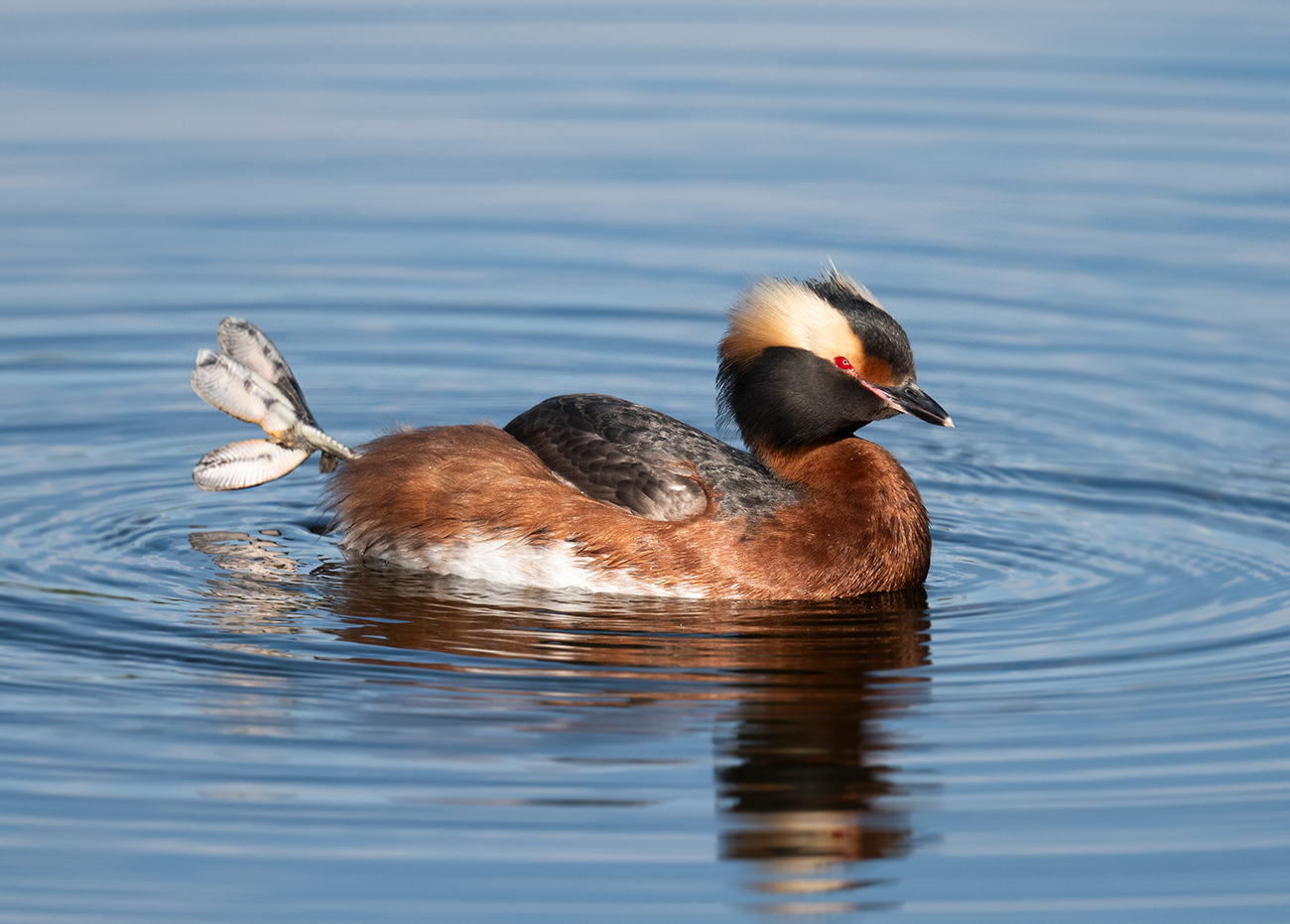 Beskrivelse: Nordisk Lappedykker,han i gang med dens vandgymnastik. I selve Kyrktjärn ynglede der 3-4 par Nordiske Lappedykkere, som gjorde pladsen trang , sådan at andre par ynglede udenfor søen. Denne han ynglede slet ikke, selv om den var i et parforhold , og dette kunne ses på begge fugle, som stadig var i fuld yngledragt. Hvorimod hos områdets andre individer var fjerdragten begyndt at falme kraftigt, så deres guldører / ananasstykker kunne næsten ikke ses mere.