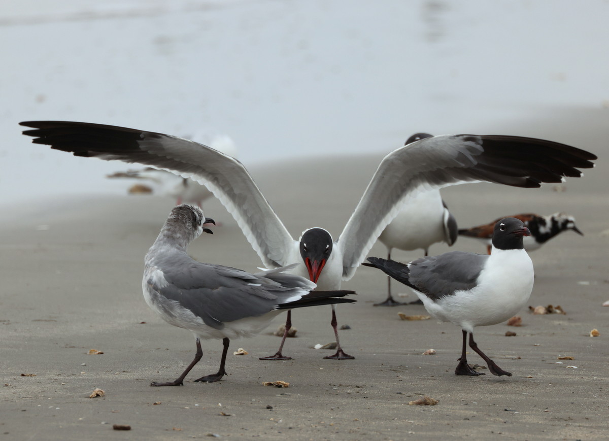 In addition to the four Laughing Gulls and the single Ruddy Turnstone there is a (second calendar-year) Bonaparte’s Gull in the picture.