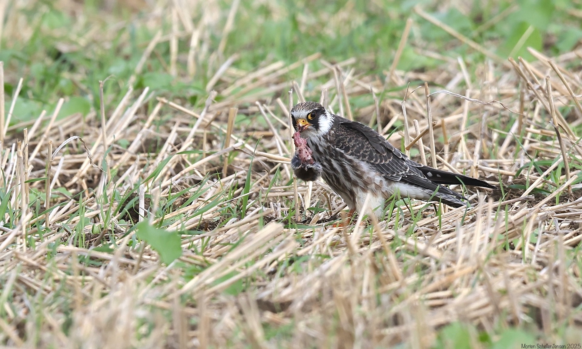 Beskrivelse: 1K Aftenfalk med Markmus som den havde stjålet fra en Tårnfalk, efter en drabelig kamp.