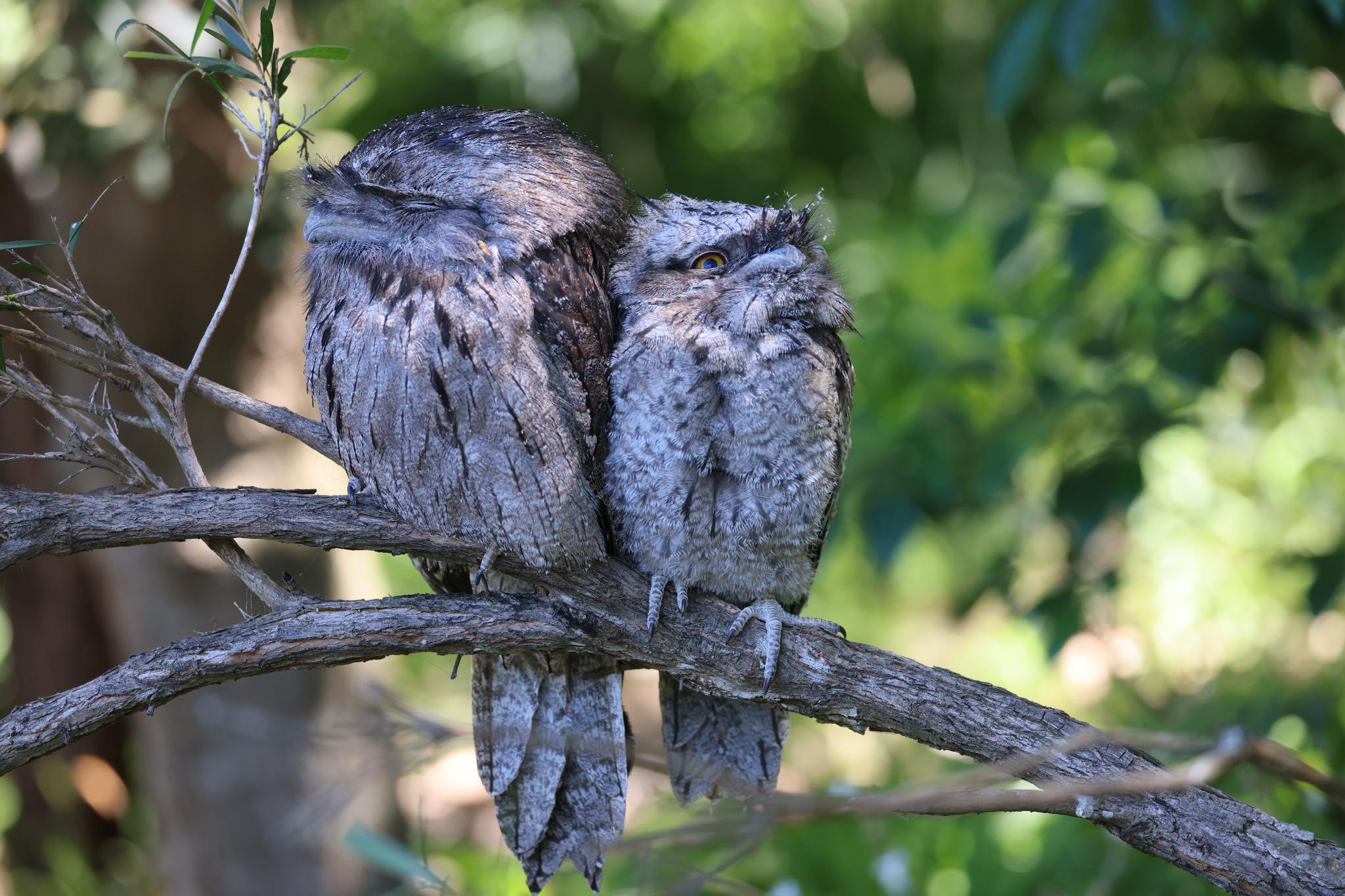 Beskrivelse: The juvenile Frogmouth is able to leave the nest and fly around already when ½ size of a grown bird. Here the birds are roosting close to a public path - in the open and 2 m above the ground. Most birds have a colour more grey than tawny.