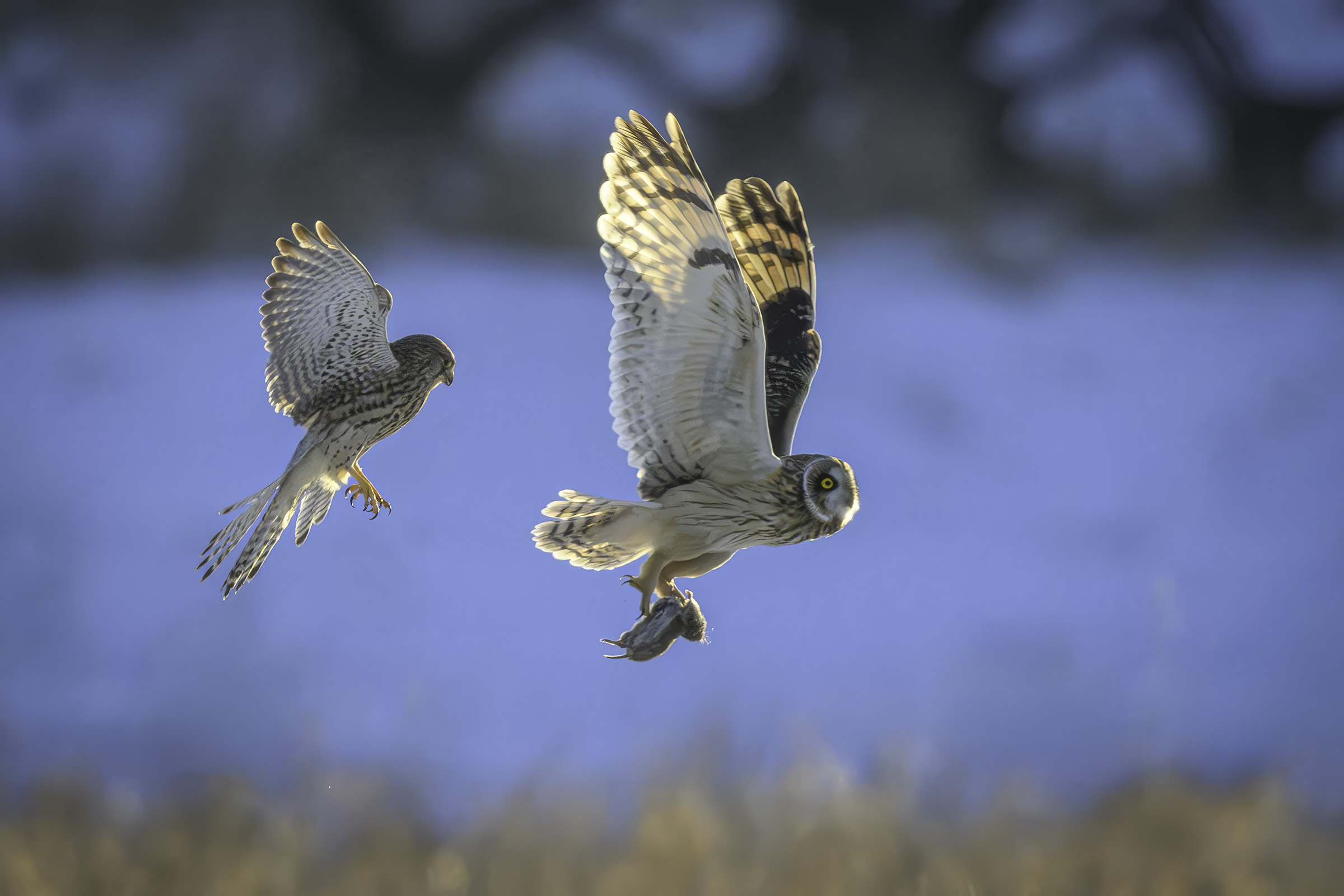 Beskrivelse: Mosehornugle med bytte jages af tårnfalk