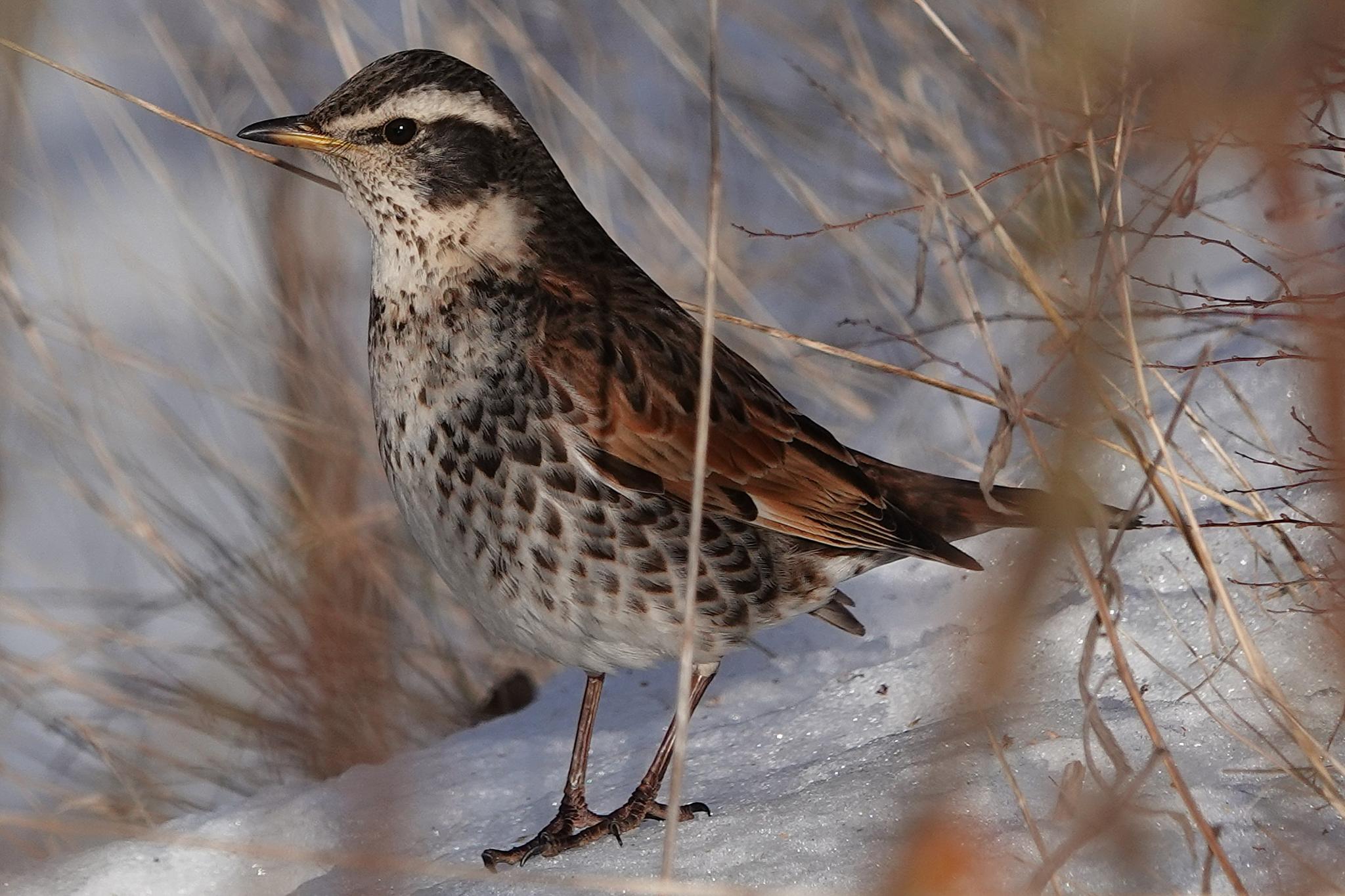 Beskrivelse: Brundroslen ved kanalen i nyfalden sne.