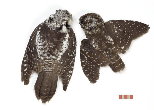 A Tengmalm's Owl is on the right side of the Hawk Owl. This bird was found dead at Roskilde November 13, 2001.