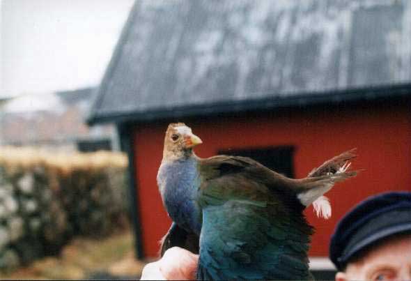 Beskrivelse: This American Purple Gallinule was found exhausted on a trawler 930 km E of Flenmish Cap, New Foundland, Canada in January or February 2002. It was kept in a box and reached the Faeroes alive in February 2002. Currently it is not known what is going to happen with this very lost bird!