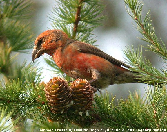Hannernes røde farve er generelt end hos de to arter. Denne fugl er intenst postkasserød, hvilket jeg ikke har set hos Stor Korsnæb, der generelt er mattere.