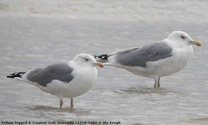 Kaspisk Måge til højre har den artstypiske meget lige og lange ryglinie, hvor tertiærerne ikke buler ud som hos Middelhavssølvmåge, og især Sølvmåge. Næbbet synes på inderdelen lidt smallere end Middelhavssølvmågen, og mange fugle mangler denne fugls fortykning ved spidsen, hvorfor næbbet bliver en lang "streg". Bemærk næbbets lidt koldt grønlige farvetone, der kan minde om Stormmåge adult´s. Øjnene synes mørke - af Jonsson benævnt "pistolskud", hvilket er en god lignelse, specielt da det ofte virker lille, og ofte er anbragt længere fortil end hos Sølvmåge og Middelhavssølvmåge. Hovedtegningerne er altid svage, normalt tydeligst som brune, lidt udvandede striber i nakken. Det anes, at fuglen har lange ben - en lang tibia antyder altid dette. Bemærk også "streetwear-hængerøven", der er en effektiv ledsagende karakter.